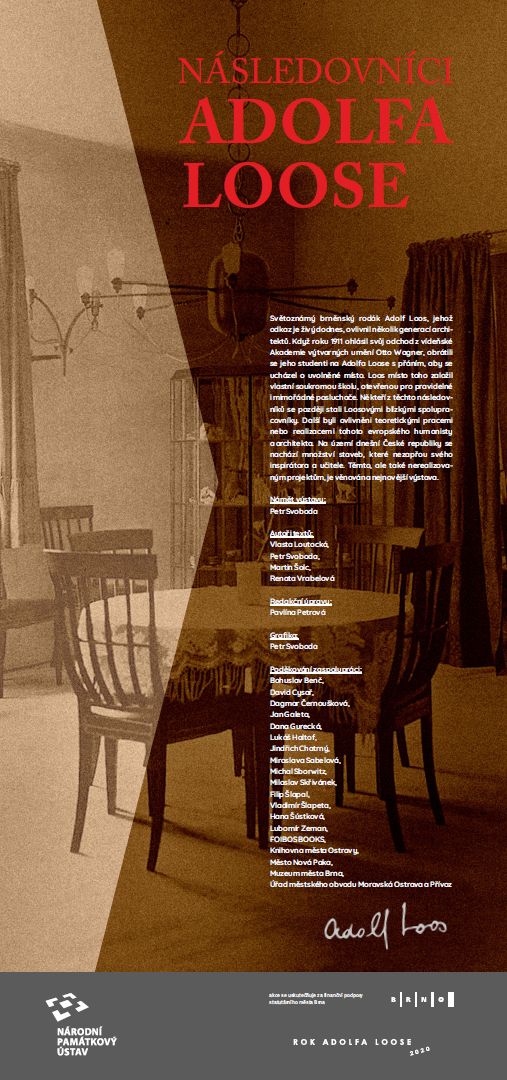 The world-famous Brno native Adolf Loos, whose legacy is still alive today, has influenced several generations of architects. When Otto Wagner announced his departure from the Vienna Academy of Fine Arts in 1911, his students turned to Adolf Loos with a wish for him to apply for the vacancy. Instead, Loos established his own private school, open to regular and occasional students. Some of these followers later became Loos' close associates. Others were influenced by the theoretical works or practical accomplishments of this European humanist and architect. There are a number of buildings on the territory of today's Czech Republic that bear witness to their inspirer and teacher. The latest exhibition is dedicated to these, but also some unrealized projects. Theme of the exhibition: Authors of texts: Editorial edits: Translation: Graphic design: Thanks for cooperation: The exhibition was created within the research goal Modern Architecture of the 20th Century, funded from the institutional support of the Ministry of Culture for long-term conceptual development (DKRVO). |