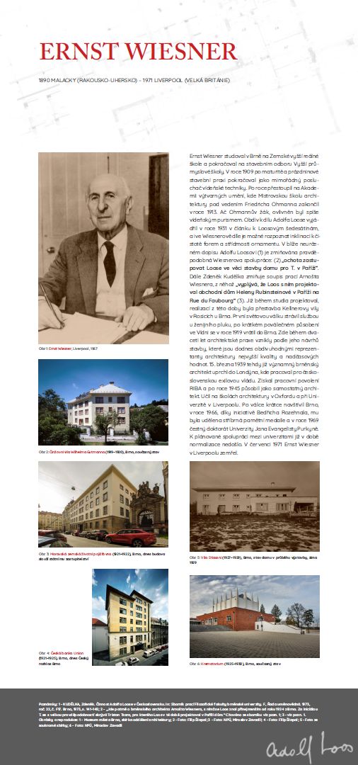 Ernst Wiesner studied in Brno at the Provincial Real High School and continued at the Construction Department of the Higher Industrial School. In 1909, after graduation and summer construction work experience, he continued as an auxiliary student of the Vienna University of Technology. A year later, he transferred to the Academy of Fine Arts, where he graduated from the Masters School of Architecture under Friedrich Ohmann in 1913. Although Ohmann's pupil, he was more influenced by Viennese purism. He expressed admiration for the work of Adolf Loos in 1931 in an article on Loos' sixtieth birthday, and even in Wiesner's work one can recognize the inclination to the purity of forms and the sobriety of ornament. An unspecified letter to Adolf Loos mentions Wiesner's likely collaboration: "willingness to represent Loos in the construction of a house for T. in Paris." Zdeněk Kudělka also mentions a list of works by Wiesner, from which "it transpires that Loos designed the Helena Rubinstein department store in Paris on Rue du Faubourg with Loos". He was already designing during his studies; he designed the remodelling of Kellner's villa in Rosice near Brno. He spent the First World War serving with the Engineer Regiment and after a short post-war stint in Vienna, he returned to Brno in 1919. During the following twenty years of architectural practice, buildings were created here according to his designs, which are still admirable representatives of architecture of the highest quality and timeless values. On 15 March 1939, the already important Brno architect fled to London, where he worked for the Czechoslovak government in exile. He obtained a work permit from RIBA and worked as an independent architect after 1945. He has taught at architecture schools in Oxford and at the University of Liverpool. After the war, he visited Brno briefly, in 1966; thanks to the initiative of Bedřich Rozehnal he was awarded a silver commemorative medal and in 1969 an honorary doctorate from the Jan Evangelista Purkyně (today’s Masaryk) University. The planned cooperation between the universities no longer took place at the time of the so-called normalization. Ernst Wiesner died in Liverpool in July 1971. |