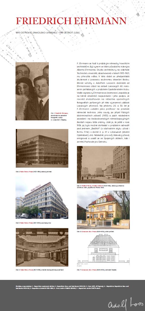 F. Ehrmann is one of Prague's German-speaking architects. He was the son of the engineer Albert Ehrmann, who worked in Vienna. His studies of architecture at the Vienna University of Technology, graduating in 1913–1921, were interrupted by the war. Experience with Loos's private construction school is assumed to have been during this time. Close relations with Adolf Loos are evidenced by Ehrmann's participation in the celebration of Loos's 60th birthday held at Prague Social Club. In addition to the signature of Ehrmann's cousin Leopold, his signature is also recognized on the list of participants. He is also identified in several joint photographs taken during this important event by Loos´ supporters. At the turn of the 1920s and 1930s, F. Ehrmann was listed as a professor at the German Technical College in Prague. His fate after the adoption of the Reich Discrimination Laws (1933) and their subsequent introduction in Czechoslovak German-language schools is not known. It is certain that in 1936 he could be found in the Prague directory under the name "Bedřich" (he also used the form Fritz in his business dealings) in house no. 41 in Lützow (today's Opletalova) Street. Subsequently, because of his Jewish origin, he emigrated and settled in the United States, where he also died. He is buried in Detroit. |