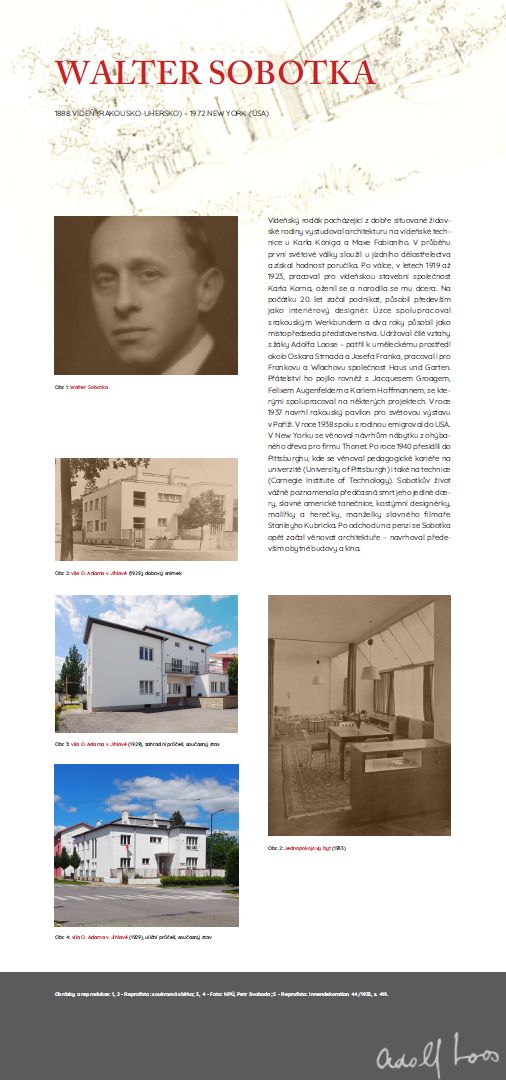 A native of Vienna from a well-to-do Jewish family, he studied architecture at the Vienna Technical University with Karel König and Max Fabiani. During the First World War, he served in the cavalry artillery and gained the rank of lieutenant. After the war, from 1919 to 1923, he worked for the Vienna construction company of Karel Korn, got married and had a daughter. He started a business in the early 1920’s, working mainly as an interior designer. He worked closely with the Austrian Werkbund and served as vice chairman of the board for two years. He maintained a lively relationship with the pupils of Adolf Loos – he belonged to the artistic environment around Oskar Strnad and Josef Frank, and he also worked for Frank and Wlach's company, Haus und Garten. He was also friends with Jacques Groag, Felix Augenfeld and Karel Hoffman, with whom he collaborated on some projects. In 1937, he designed the Austrian pavilion for the World Exhibition in Paris. In 1938 he emigrated with his family to the USA. In New York, he designed bentwood furniture for Thonet. After 1940, he moved to Pittsburgh, where he pursued a teaching career at the University of Pittsburgh and also at the Carnegie Institute of Technology. Sobotka's life was seriously marred by the untimely death of his only daughter, a famous American dancer, costume designer, painter and actress, the wife of the famous filmmaker Stanley Kubrick. After retiring, Sobotka began to focus on architecture again – he mainly designed residential buildings and cinemas.